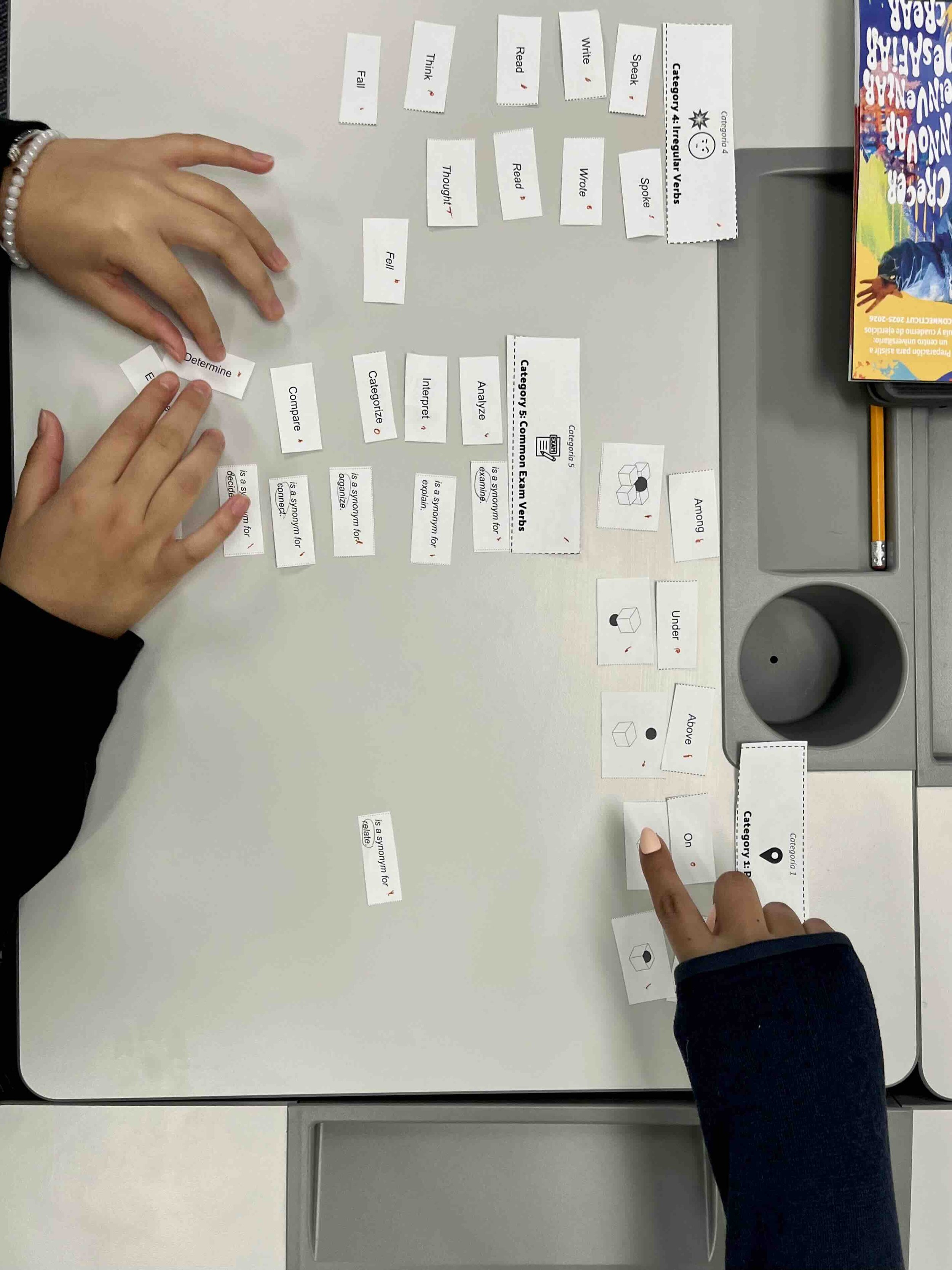 Two newcomers participate in a word sort to identify irregular verbs, prepositions of place, English-Spanish cognates, and confirmation bias related terminology.